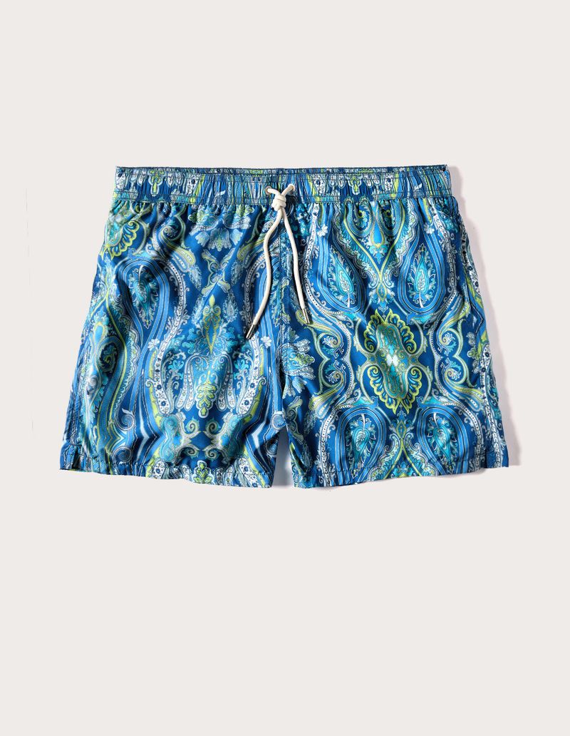 Men’s boxer swimsuit with an all-over paisley print, rich in ornamental details in shades of blue, aqua green, and accents...Read more
