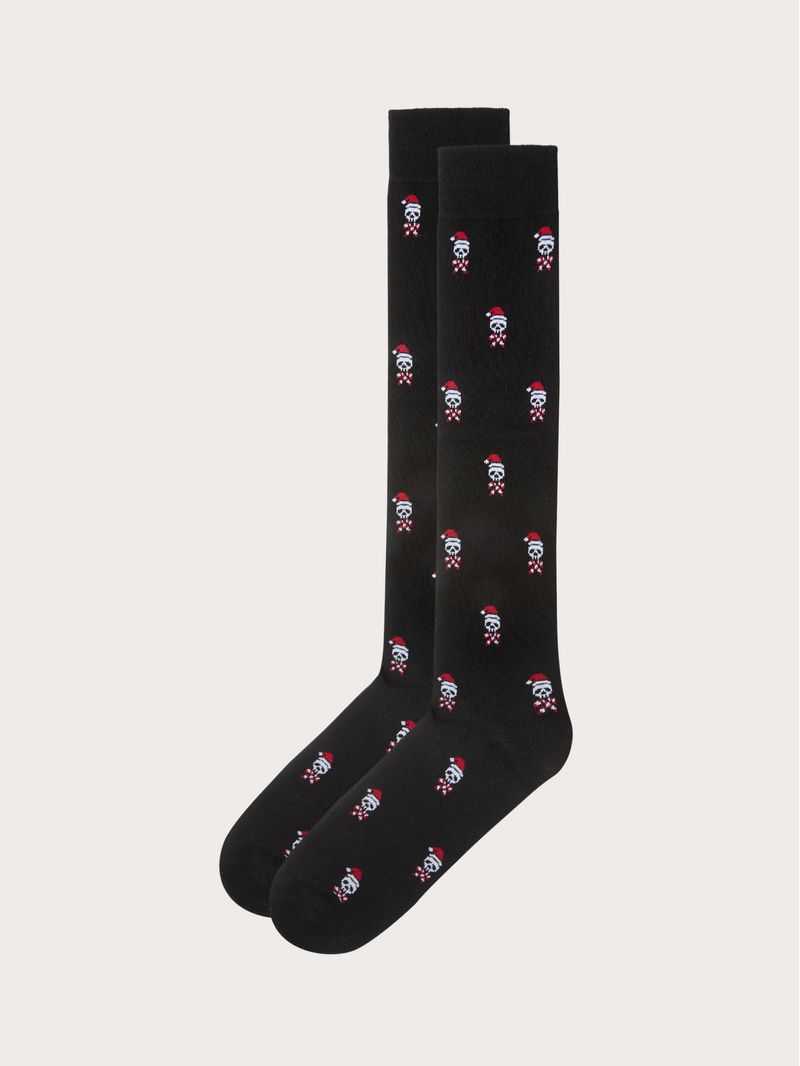 Calze uomo lunghe in cotone elasticizzato con micro-disegno teschietto stilizzato con cappello di Babbo Natale Hello Xmas...Leggi di più