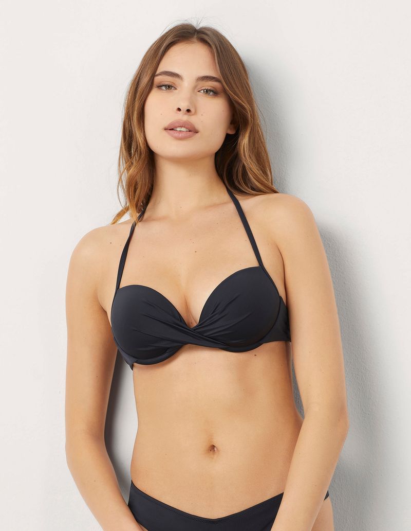 Reggiseno push up del costume nero, con ferretto, chiusura posteriore con fiocco. Spalline sottili da regolare con fiocche...Leggi di più