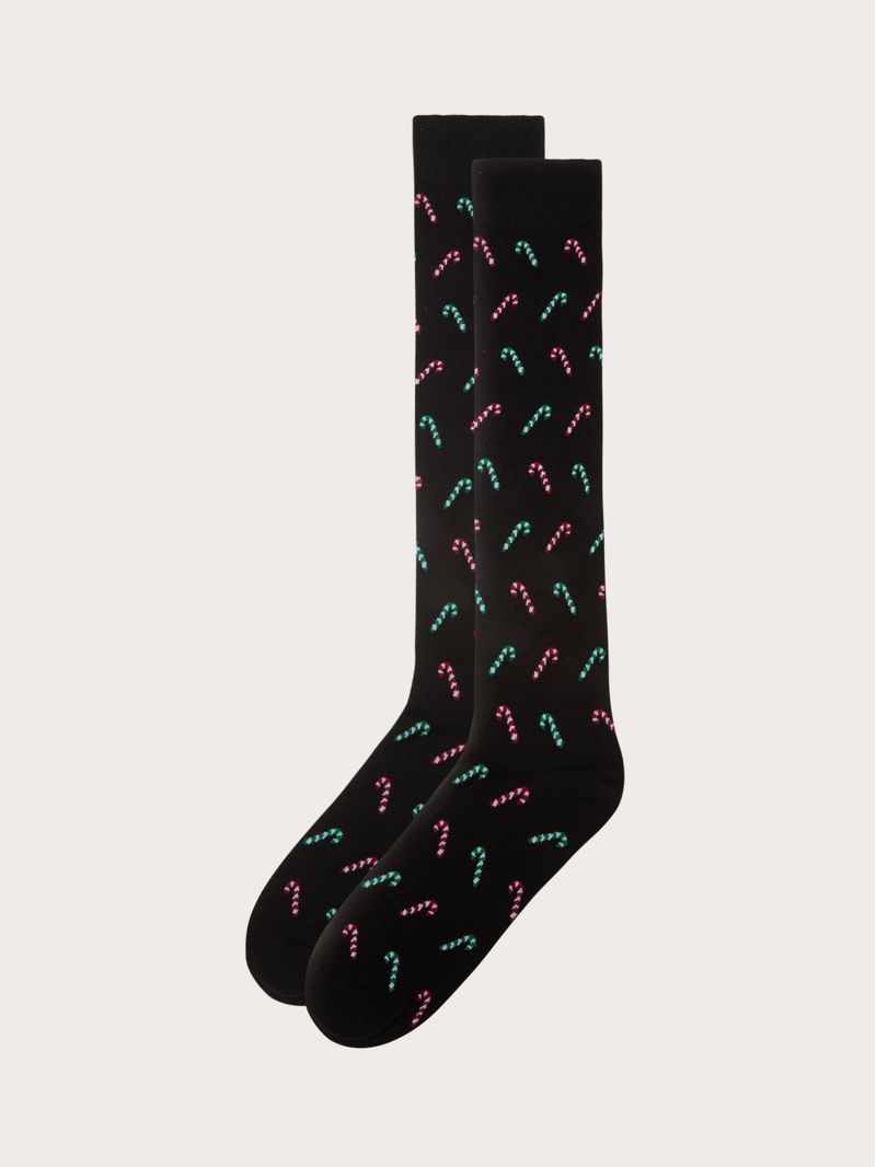 Men's long black socks decorated with candy canes in two Hello Xmas color variants. An iconic pattern, designed for a simp...Read more